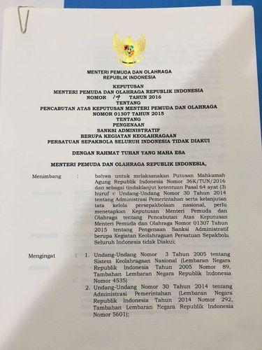 "Soal PSSI baru saja saya tanda tangani, saya cabut surat (SK Pembekuan) yang pernah kami keluarkan," ujar Imam saat ditemui di Plaza Senayan, Selasa (10/5).