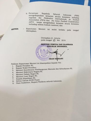 Menpora sudah mengumumkan pencabutan pembekuan PSSI sejak tadi malam, Selasa (10/5). Namun, Menpora baru memberitahukan sekaligus menunjukkan isi surat tersebut hari ini, Rabu (11/5).